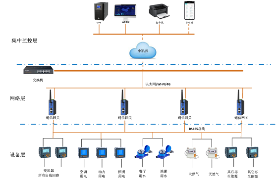 中凱能耗監(jiān)控系統(tǒng)基于中凱云平臺(tái),現(xiàn)場能耗監(jiān)測設(shè)備進(jìn)行能耗數(shù)據(jù)采集,通過智能網(wǎng)關(guān)組網(wǎng),將數(shù)據(jù)上傳至中凱云平臺(tái)。web端及移動(dòng)端app通過訪問云服務(wù)器同步數(shù)據(jù),監(jiān)控系統(tǒng)實(shí)現(xiàn)數(shù)據(jù)監(jiān)測、分析、評(píng)估等功能。